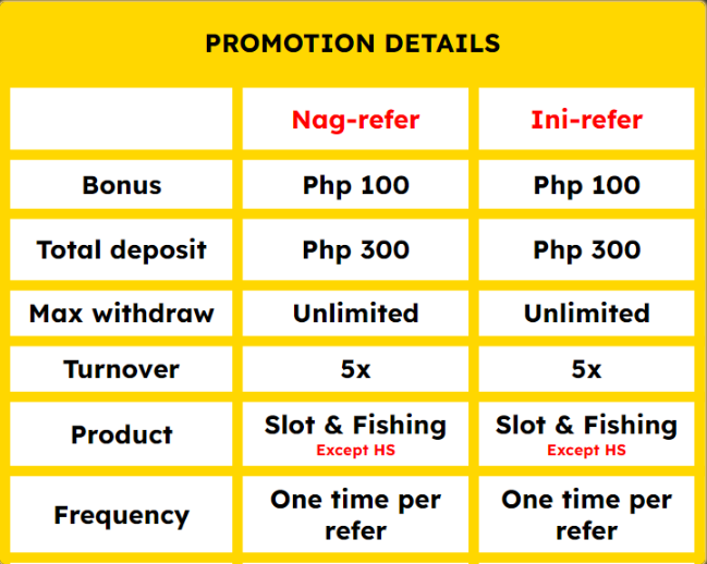 Ang ni refer ay kinakailangang makapagdeposit ng 300 at magkaroon ng 2,400 na turnover sa loob ng 14 days after mag register